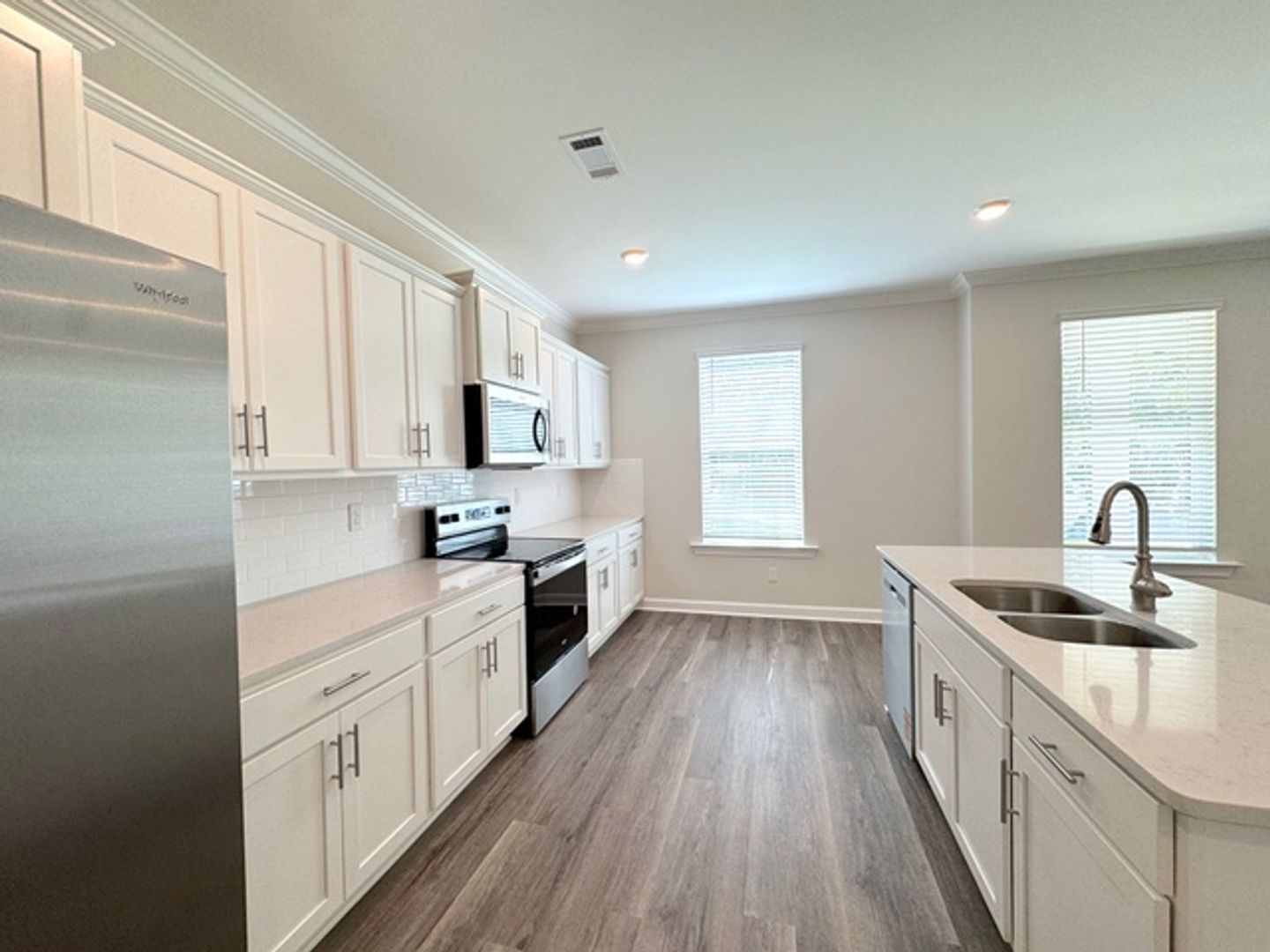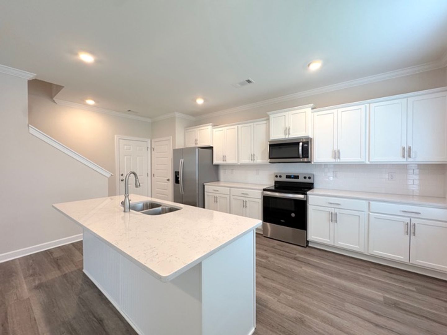 The kitchen has stainless ELECTRIC APPLIANCES, a large center island, QUARTZ COUNTER TOPS, a pantry & plenty of countertop/cabinet space!